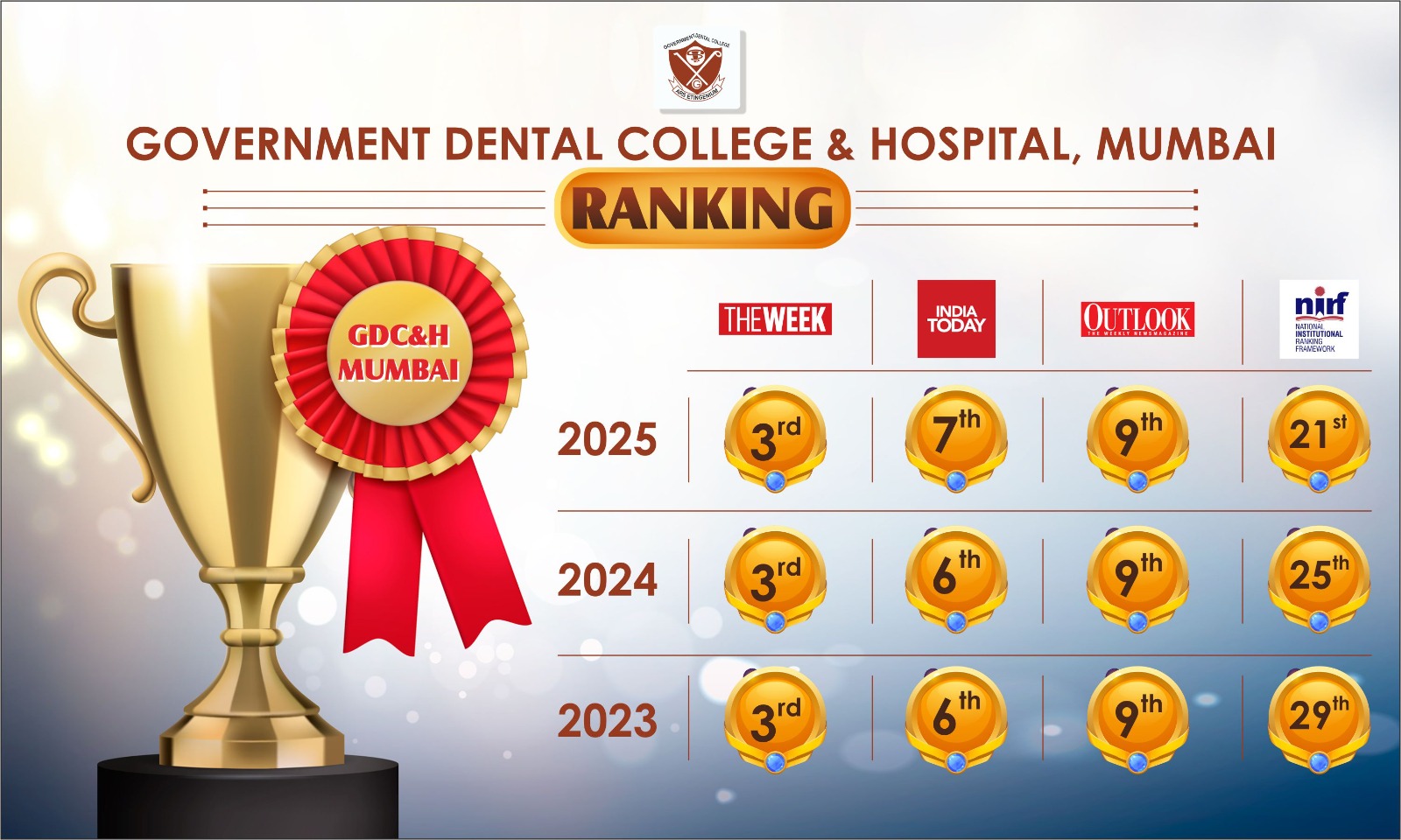Government Dental College and Hospital, Mumbai is one of the premier institutes of India imparting Dental Education and Services to the country as well as abroad since its establishment in the year 1928 till today. The Institute has been named in the Top Three Dental Colleges in India by the Outlook Magazine for the past 7 years.